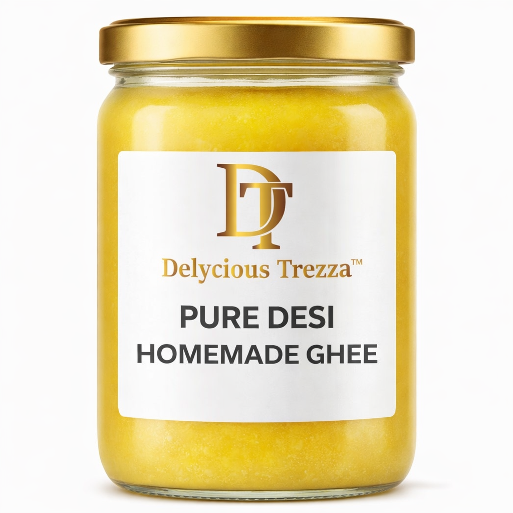 Delycious Trezza Pure Homemade Desi Ghee is carefully prepared using traditional home-style methods to preserve its natural aroma, rich taste, and nutritional value. Made from fresh, high-quality milk cream, this ghee is slowly heated and clarified to achieve a golden texture and authentic flavor that reflects the purity of homemade goodness.